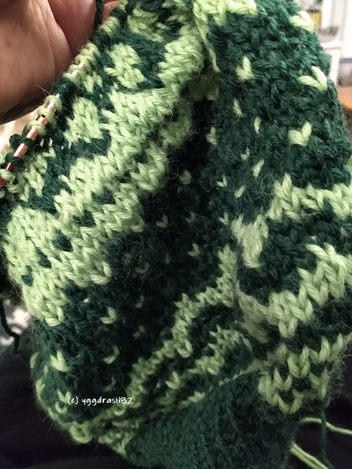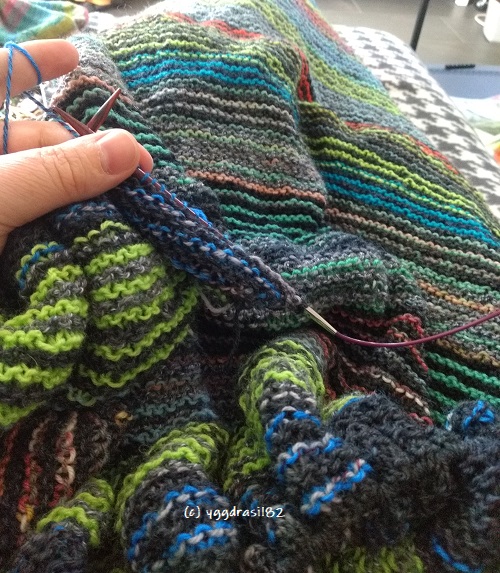 Das Garn mag ich sowieso sehr gern und auch von der Anleitung bin ich begeistert. Anfangs hatte ich die Befürchtung, dass sich das Ganze zieht, wie Kaugummi, aber das Muster gab genug Abwechslung her und vor allen Dingen Motivation in Form von “ein Mustersatz geht noch”.