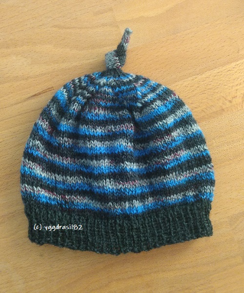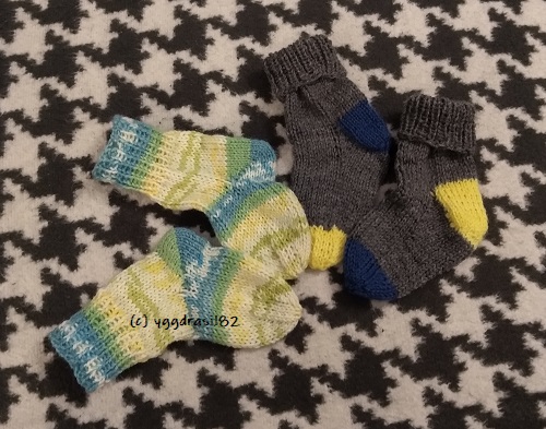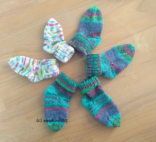 Ansonsten habe ich noch Socken gestrickt. Ein Paar im einfachen Rippenmuster für mich, ein fast-Stino-Paar, dass ich gegen einen Strampler eintausche und zwei Paar Babysöckchen. Eins für unser Kind und eins für das Kind von meinem Großcousin und seiner Frau. Für letzteres Kind habeich noch eine Mütze gestrickt und werde das ganze dann per Post auf die Reise zur Nordsee schicken.