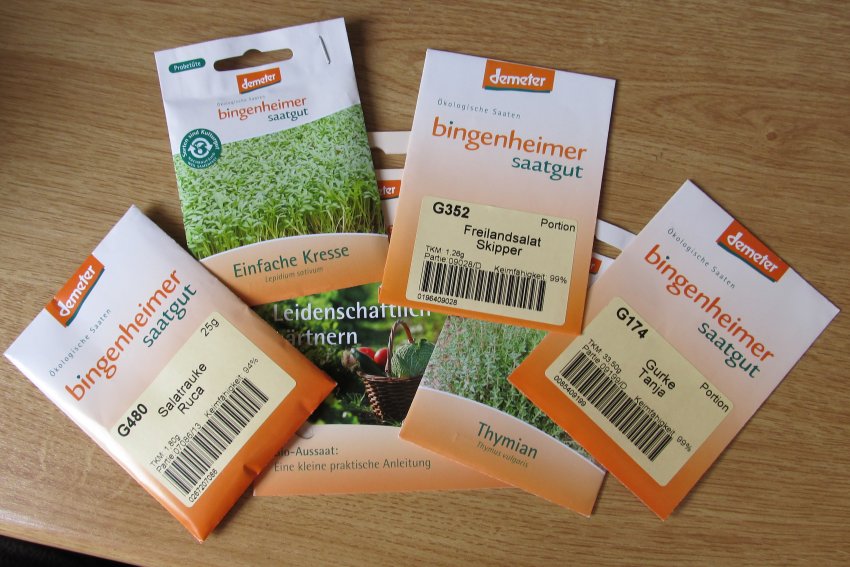 Dann habe ich von Merin noch den Tipp bekommen, es doch mit der Bestellung mal bei der Bingenheimer Saatgut AG zu versuchen. Auch hier ist meine Bestellung mittlerweile angekommen. Als Neukunde habe ich noch einen sehr netten Brief, ein kleines Heftchen mit Tipps zum Bio-Gärtnern und eine Gratis-Packung Kressesamen dazubekommen. Das fand ich wirklich eine sehr nette Geste. Und das habe ich dort bestellt: