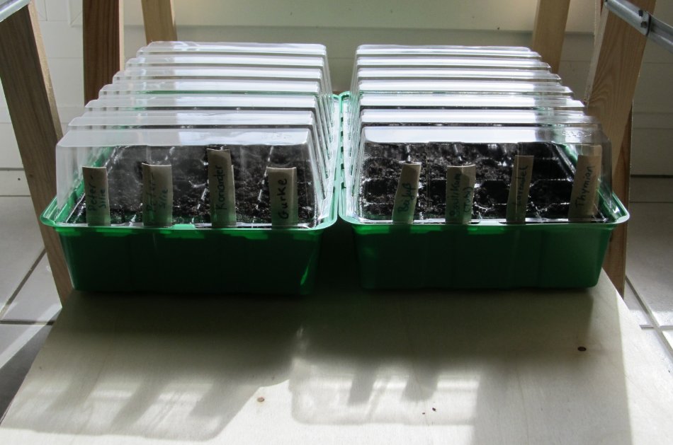 Ich finde es wirklich ganz toll mit den Händen arbeiten zu können. Ob ich mit beiden Händen im Teig stecke oder in der Erde herumwühle – das gibt mir ein wirklich wundervolles Gefühl. Ich vermute mal stark, weil ich sonst den lieben langen Tag nur “virtuelle Arbeit” vor mir habe. Man sieht kein direktes Ergebnis, anders als es bei Handwerkern der Fall ist. Jedenfalls habe ich heute Kräuter und Gemüse gesät und hoffe, dass auch was wächst. Was ich nicht vorziehe ist natürlich Kresse, sowie den Freilandsalat und die Rauke. Alles andere ist in zwei Mini-Gewächshäusern gelandet, gegossen, beschriftet und schön ans Fenster gestellt worden: