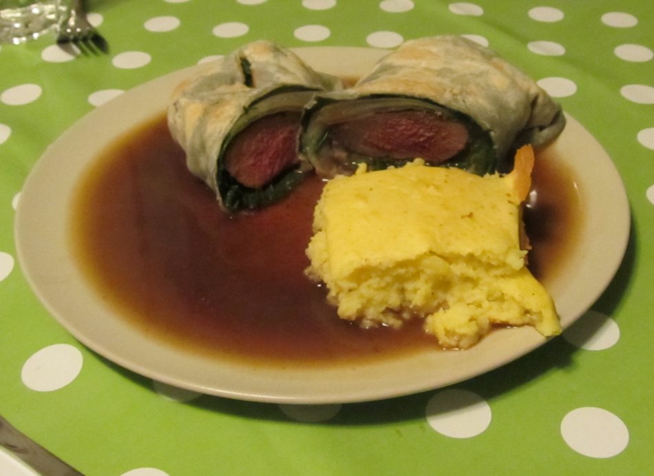 Es gab Rehrückenfilets in Mangold und Strudelteig. Dazu gab es dann einen Kartoffelkuchen und eine Rotweinsoße, die wir aus Knochen und “Resten” gekocht haben.