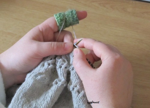 Damit ich nun diese harte, kratzige Wolle vernünftig verstricken kann, habe ich mir einen Fingerschoner gestrickt. Dieser ist – ganz einfach – ein kleiner Strickschlauch, der über den Zeigefinger gestülpt wird. Dort läuft dann die Wolle beim Stricken darüber und hinterlässt keine Spuren auf meinen “zarten Fingerchen”. 😉