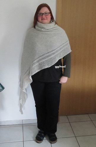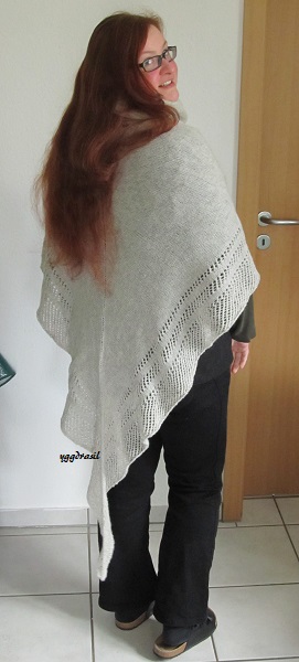 Da man bei dem Muster nur rechte Maschen hat und – abgesehen von der Lacekante – keine großen Abwechslungen, ist es recht eintönig zu stricken. Auf der einen Seite brauchte ich also schon ein wenig Durchhaltevermögen, auf der anderen Seite eignet sich dieses Muster sehr gut für Stricktreffen oder um nebenher spannende Hörbücher zu hören, etc. Dennoch habe ich das Tuch zwischendurch einfach mal eine Woche weglegen und ignorieren müssen. 😉