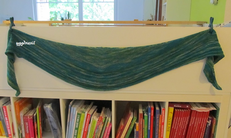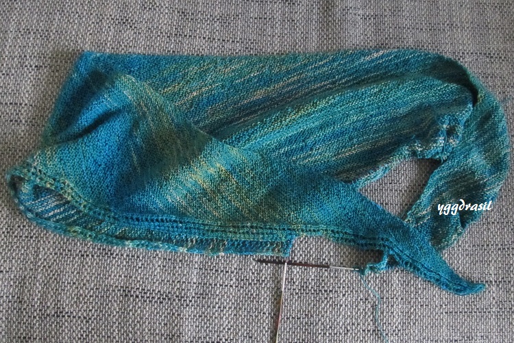 Da ich drei Knäuel der Wolle gekauft habe, ich für das obige Tuch aber lange nicht so viel verstrickt habe, nutze ich den Rest nun für ein weiteres Tuch, dass ich schon seit Ewigkeiten stricken wollte: “Trillian” von Martina Behm (ebenfalls ravelry-Link). Auch dieses Muster ist eingängig und gut zu stricken.