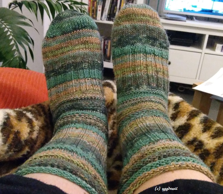 At the moment I’m constantly thinking about some really bad things that I have to solve plus I still feel sick which makes solving the bad things even more difficult. Anyway: Knitting is currently not priority #1 in my life. But I managed to finish the first proper pair of socks for me! Top-down! With a proper heel. Yay! The socks look a bit odd but they are so comfy! So I started the 2nd pair of them right away.