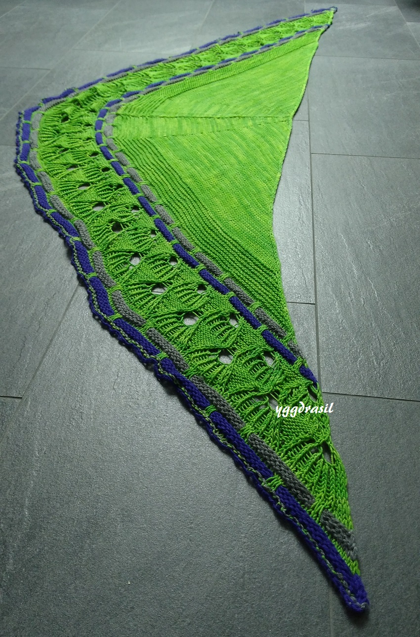 Leider hatte ich von der grünen Wolle doch nicht genug da, so dass das Tuch ein paar Mustersätze kleiner geworden ist. Nach dem Waschen und Spannen ist es aber noch gut gewachsen und trägt sich gut. Das Muster geht gut von der Hand. Ein, zwei Mal musste ich mehrfach lesen und auch ein paar Maschen zurückstricken aber das gehörte wohl eher in die Kategorie “wer lesen kann ist klar im Vorteil”. Das Muster ist auf jeden Fall ein Kandidat fürs noch mal stricken.