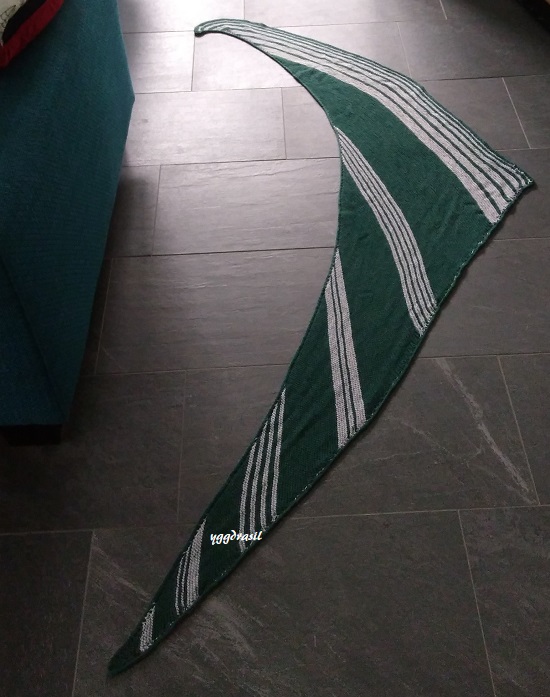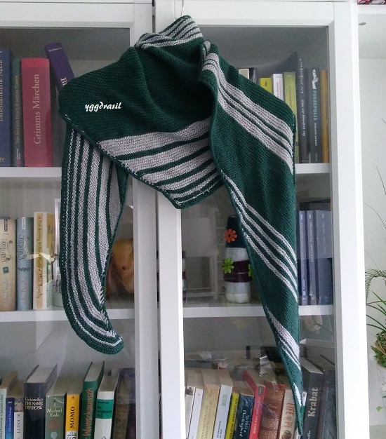 Aus dem Februar-Projekt hatte ich ja noch die CoopKnits Socks Yeah! übrig. Nachdem ich noch einen Strang in dunkelgrün und zwei in Grau nachgekauft hatte, habe ich einfach kraus rechts drauflosgestrickt. Ich wollte ein asymetrisches Dreieckstuch haben. Ich finde, die tragen sich zusammen mit den halbrunden immer noch am besten.
