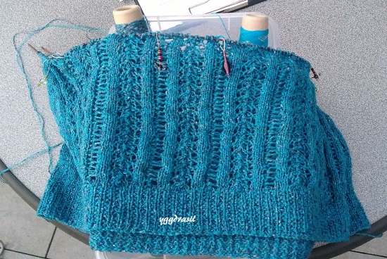 Der Lace-Teil befindet sich am Rückenteil, das Vorderteil ist glatt rechts gestrickt. Nach anfänglichen Schwierigkeiten kann ich das Lacemuster (4 Reihen) nun auswendig. Eigentlich ist das Muster eingängig, aber irgendwie wollte es zuerst nicht so recht in meinen Kopf.