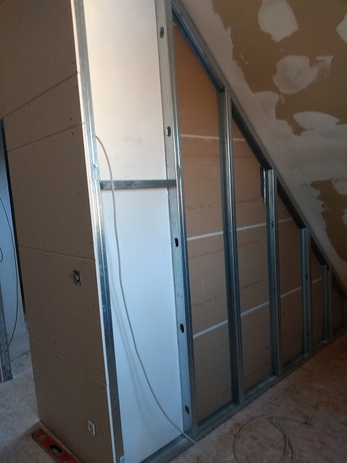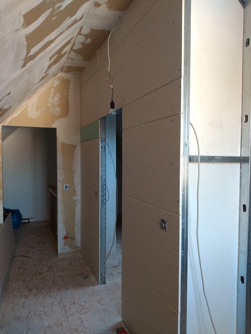Die nächsten Schritte nach Einbau des Ständerwerkes und Anbringen der Gipskartonplatten waren dann Spachteln und Schleifen der Fugen.