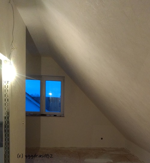 Nach einigem Überlegen, haben wir uns dazu entschieden, im Abstellraum nicht zu tapezieren. Stattdessen hat der Mann dort noch sorgfältiger gespachtelt und geschliffen. Anschließend hat er alle Wände und die Decke grundiert und den Abstellraum zwei Mal gestrichen. Die Farbe hatte er glücklicherweise noch im Keller gefunden; sie war wohl von der großen Streichaktion vor unserem Einzug übrig geblieben. Wenigstens gab es hier also keine Probleme bei der Beschaffung.