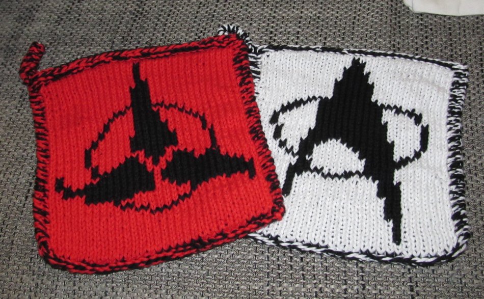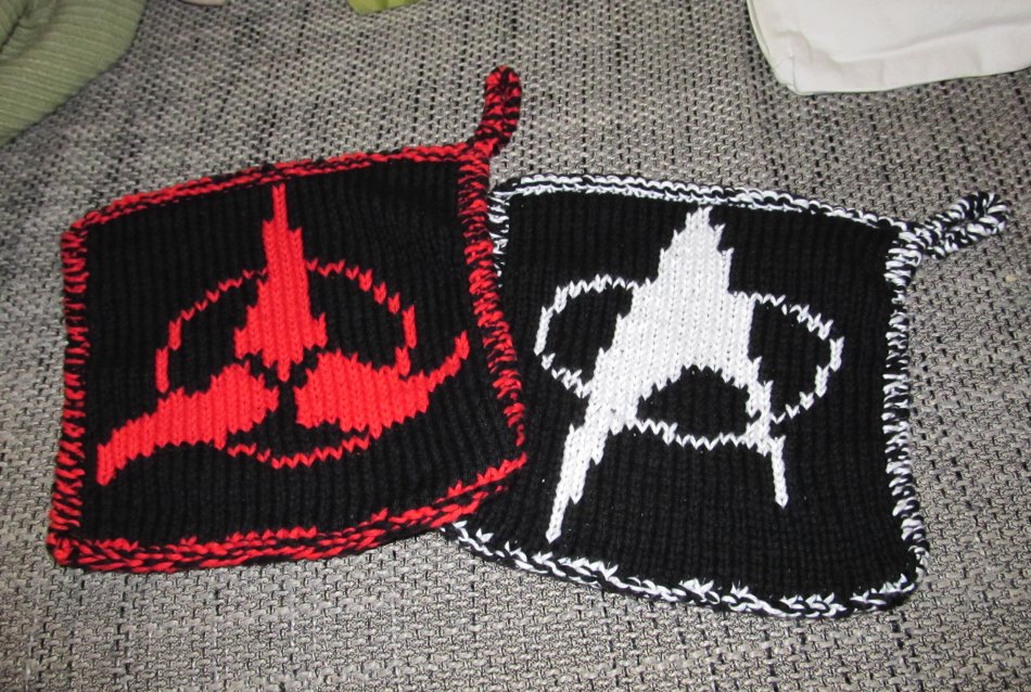 Hey, ich hab einen eigenen Handarbeitsblog – knitchicks.net – weil ich stricke. Und altbacken ist gar nix. Und mit den Federation und Klingon Logos erst recht nicht.